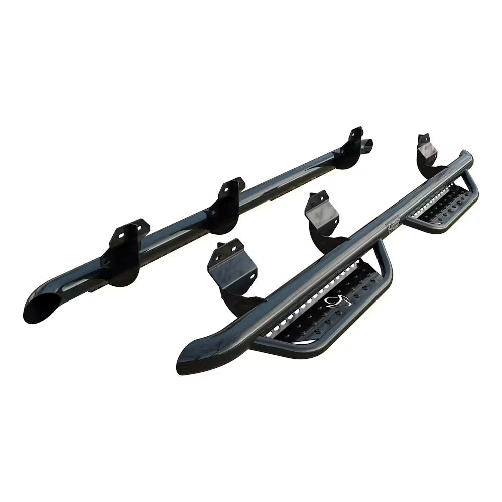Strong and dependable, Ranch Hand Legend running steps are constructed from 3 in. pipe and 3/16 in. thick brackets for enhanced security to the truck. The steps are frame-mounted in factory locations for easy installation with no drilling required on most models. The front step plates are punched with the official cowboy hat Ranch Hand logo, and all steps have raised steel treads to promote reliable traction when entering or exiting your truck. To maximize safety, Ranch Hand running steps have a vehicle-specific configuration to match the door layout and promote optimal safety and convenience. They feature 1-1/2 in. diameter, drop-down tubes that hold 4 in. wide, 12-gauge punched plates for the perfect platform for stepping into your truck with ease. Each set of steps is finished with a tough, dual-layer A-coat and gloss black powder coating that provides exceptional rust resistance for long-lasting dependability. This particular set of Ranch Hand Legend running steps fits select model years of the Ford F-150, Ford F-250 Super Duty and Ford F-350 Super Duty (see application info to verify fitment).